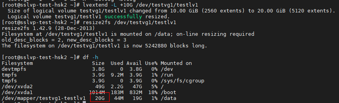 # resize2fs /dev/testvg1/testlv1