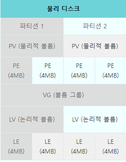 LV가 나누어진 일정한 크기의 블록으로 물리적 크기인 PE와 1:1 대응합니다.