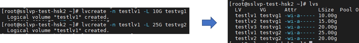 | LV생성(전체할당) | lvcreate | lvcreate -n testlv -l 100%FREE testvg |